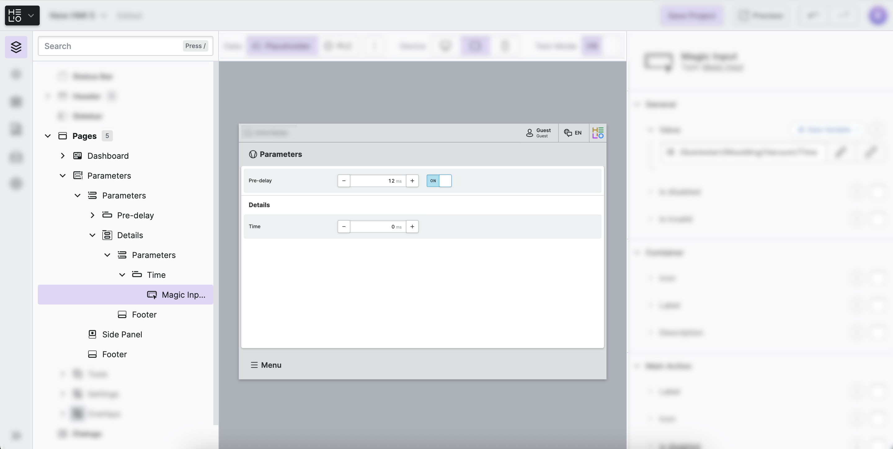 Just like the Dashboard Page in the previous step, the Parameter Page comes predefined for your convenience. That's why your page already contains one parameter, with a default Magic Input. For the purposes of this tutorial, we will simply delete it and start from scratch.