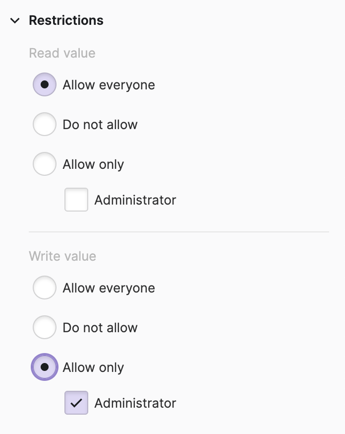 Go to the Data View and locate the HMI Data Explorer. Select the variable you would like to manipulate and locate the Restrictions property group on the right.