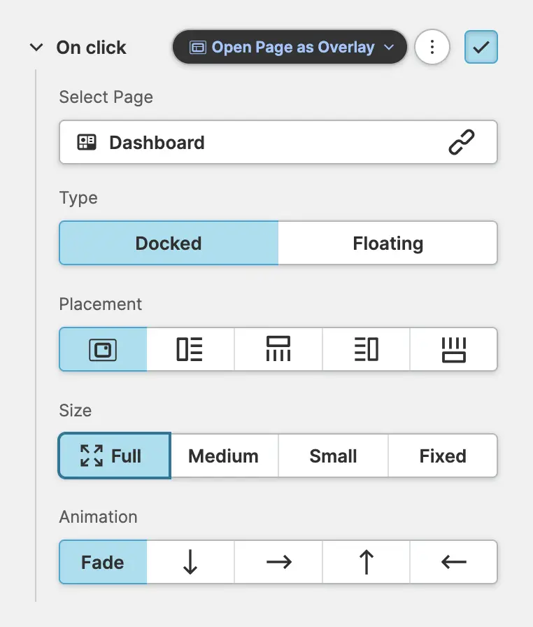 Lets you adjust the way the overlay will animate into the current page. Choose between fading the Overlay in or sliding it in from either side.
