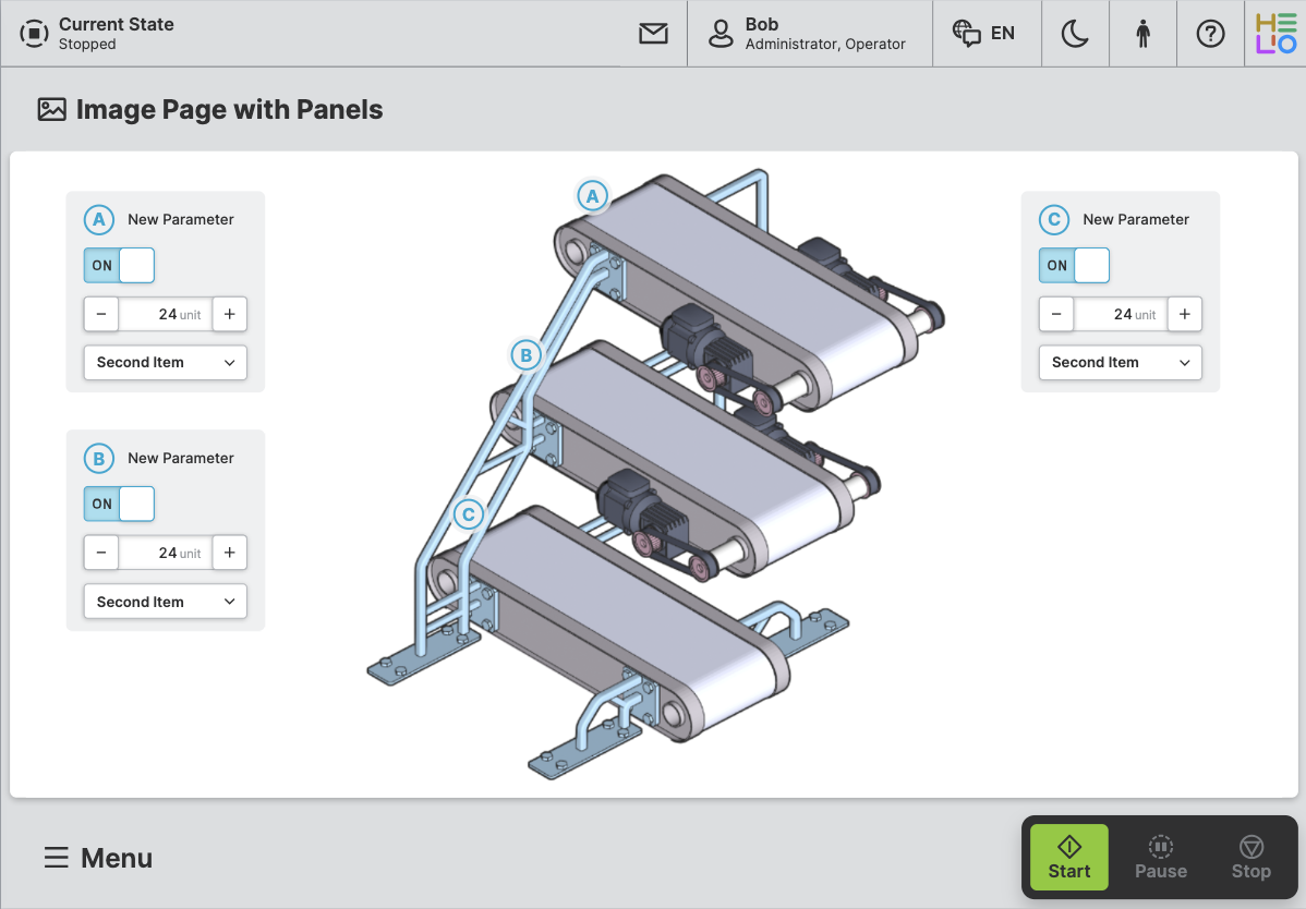 An Image Page With Panels allows operators to view a full page image and set overlaying panels to view details or execute specified actions.