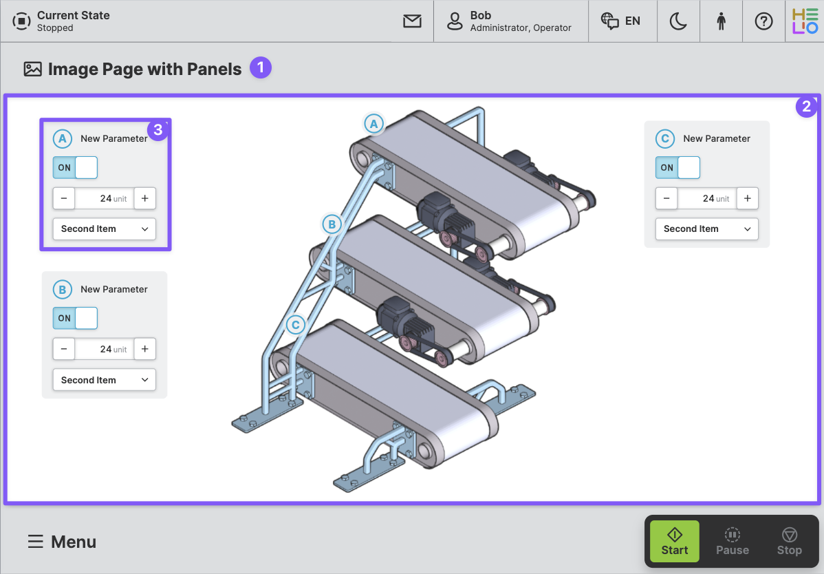 Purpose: Display a background image and then place interactive panels above it. Within the panels, you can allow operators to edit parameters or trigger actions. Use image markers and panel legends to create an interactive connection between the image and the content above it.